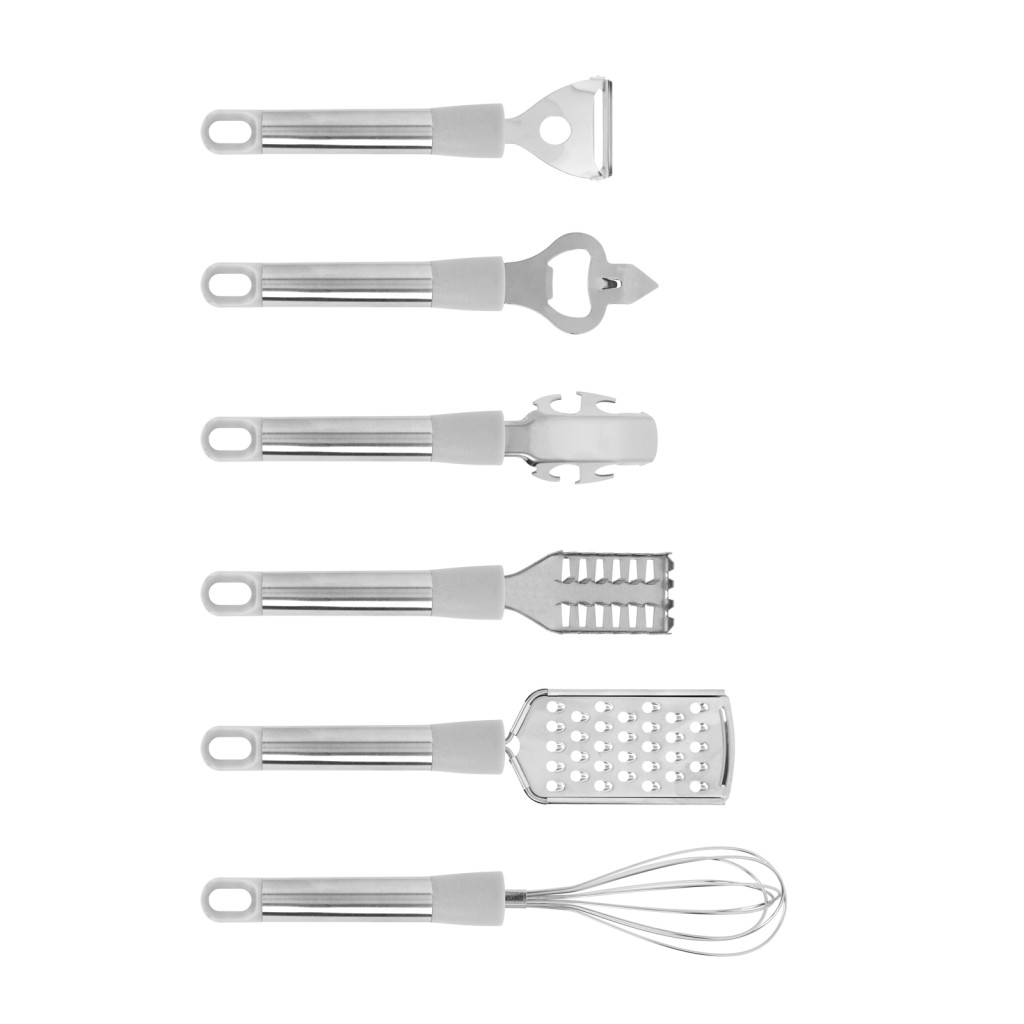 Rozsdamentes acél nyéllel rendelkező konyhai eszköz szett. Helytakarékosan, könnyen áttekinthetően tárolhatja a mindennapi használati eszközeit. A főzés szinte minden területét lefedő készletben talál többek között habverőt, sajtreszelőt, zöldséghámozót, halpikkely eltávolító eszközt, sörbontót, konzervbontót is.