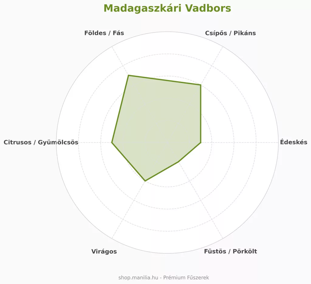 A Madagaszkári vadbors megjelenése is egyedi: a parányi bogyóknak jellegzetes kis „farka” van. Íze kezdetben fűszeres, de a fekete borsnál enyhébb, nem harsány. Amiben igazán különleges, az a lecsengése: a kezdeti csípősség után egy frissítő, enyhén citrusos, virágos és fás aroma bontakozik ki, amely hosszan megmarad.